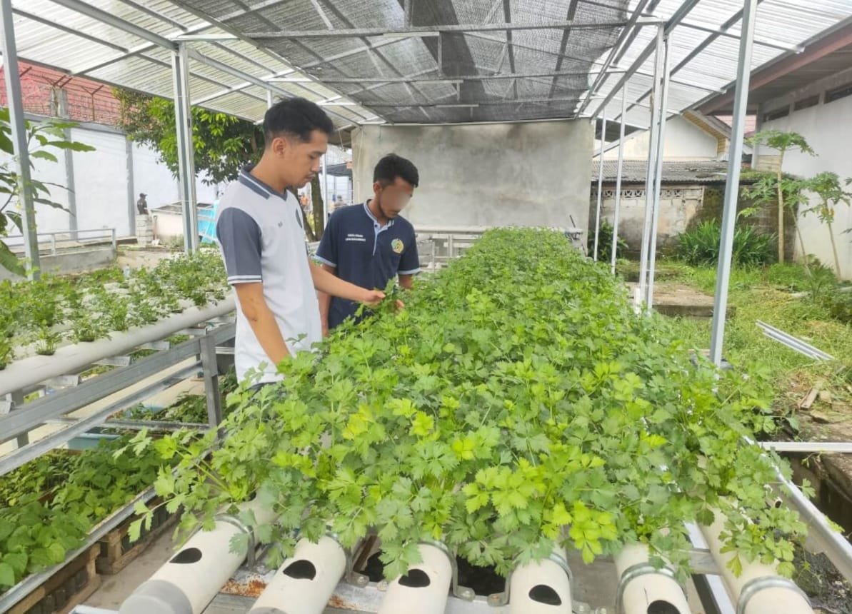 Petugas Seksi Kegiatan Kerja (Giatja) Lapas Kelas IIA Banjarmasin melakukan pemantauan rutin terhadap tanaman seledri yang dibudidayakan dengan metode hidroponik, Jumat (12/09). Tanaman terlihat tumbuh subur, hijau, dan segar, menandakan perawatan yang optimal oleh Warga Binaan Pemasyarakatan (WBP).
