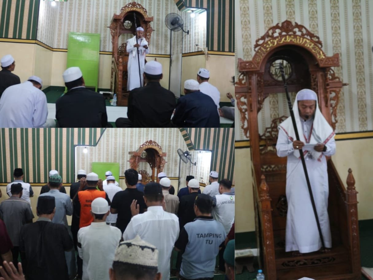 Kegiatan ibadah Jumat di Lapas Banjarmasin ini berjalan dengan khusyuk dan tertib. Tampak Kalapas Akhmad Herriansyah, Kasubsi Bimkemaswat Muhammad Ansyari, jajaran struktural, serta petugas turut mengikuti kegiatan salat Jumat bersama para WBP.